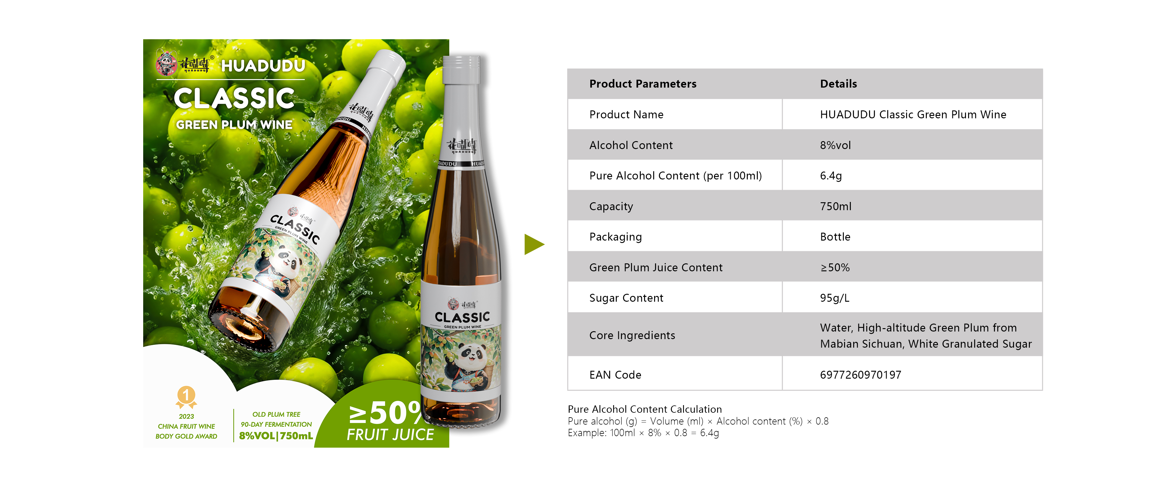 The HUADUDU Mulberry Green Plum Wine | Per 100ml | 12% | 110kcal | 0g | 0g | 10.6g | 0g |