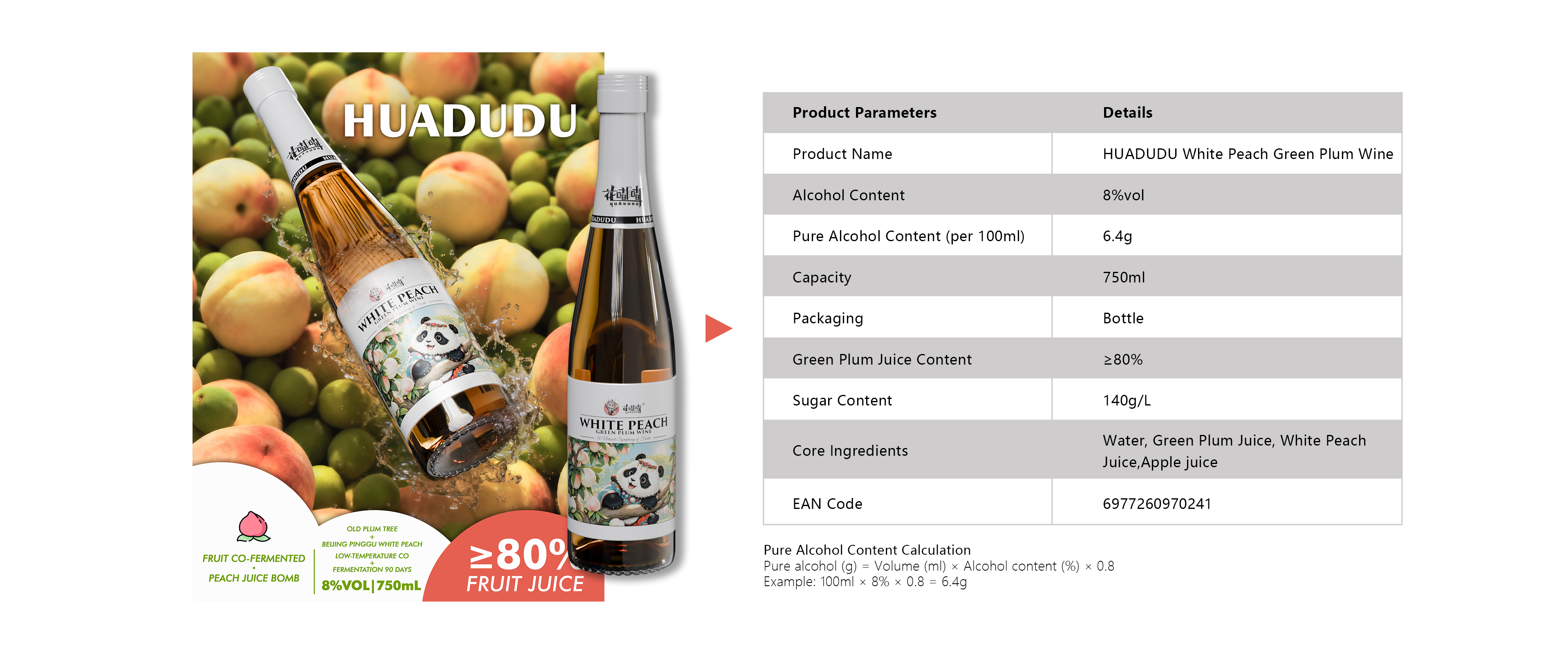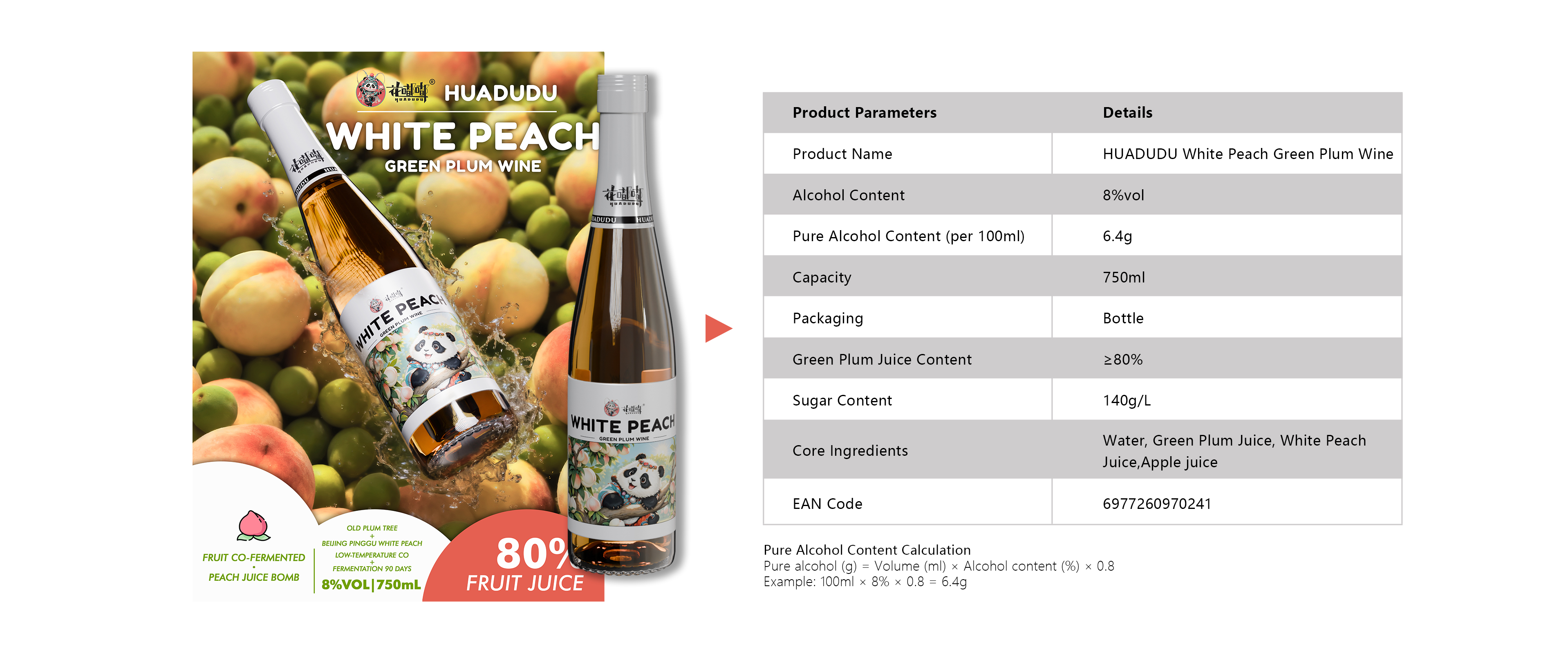 The HUADUDUWhite Peach Green Plum Wine | Per 100ml | 8% | 101kcal | 0g | 0g | 14g | 0g |